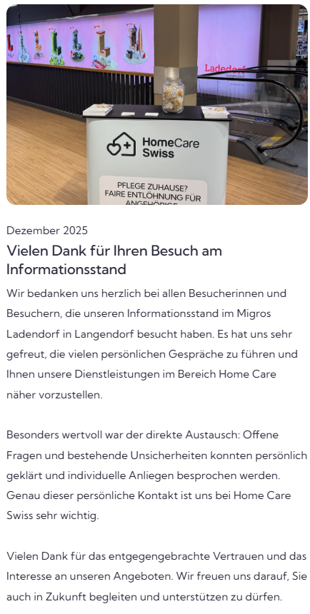 Faktenanalyse Krankenkassenprämien und AngehörigenpflegeVielen Dank für Ihren Besuch an unserem Informationsstand in der Migros Ladendorf Langendorf. Die Gespräche und das Interesse an Pflege zuhause haben uns sehr gefreut.